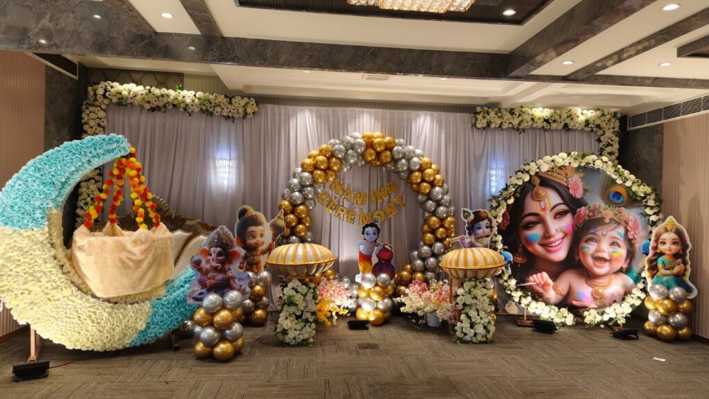 Baby setups involve many small, delicate elements — from placing individual petals to arranging favour tables. Budget 3–5 hours for full setup, and always confirm venue access well in advance so nothing feels rushed.